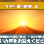 2025年12月25日 / 最終更新日時 : 2025年12月22日 CES WEB管理者 その他 年末年始休業のお知らせ 弊社の年末年始休業について、お知らせいたします。 休業期間 ■2025年12月27日(土)~2025年1月4日(日) ※1月5日(月)より通常通り営業いたします。